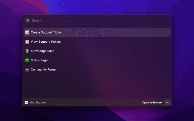 Need to open a ticket or check on an existing one? Need to check the status page, or want to contribute to the Community Forum? We got you. Use the Get Support command for quick access to these handy pages.
