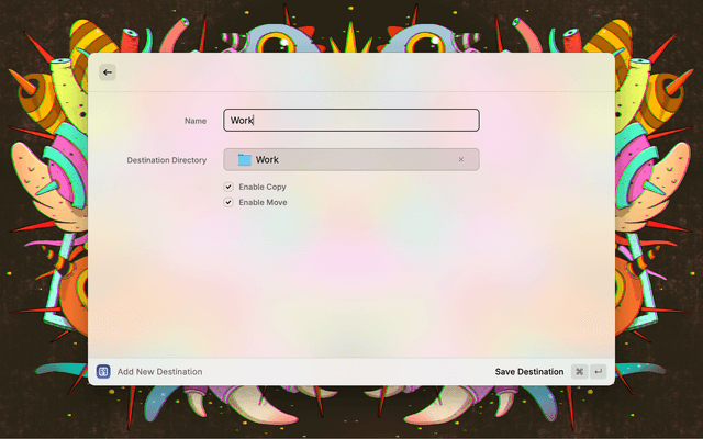 Save time moving files between folders. Define destinations once, use quick commands to copy or move files effortlessly