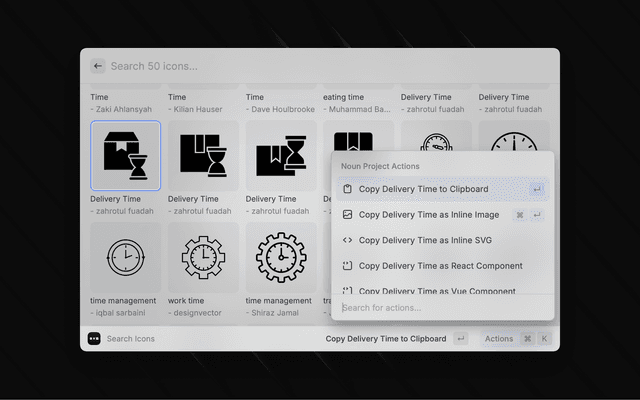 Search for and download SVG and PNG icons from the Noun Project. Copy icons to your clipboard and immediately paste them into apps like Miro, Pitch, Google Slides, and more. You can also copy the icons as HTML images, inline SVGs, and even React and Vue components.