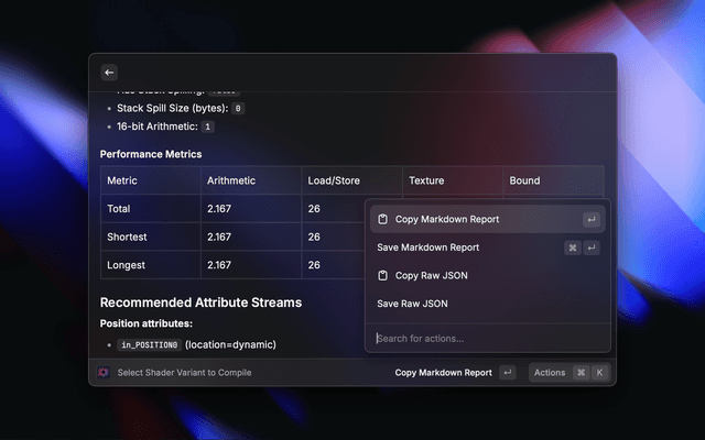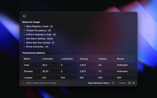 Profile GLES shaders using the Mali Offline Compiler (MaliOC) directly from Raycast.