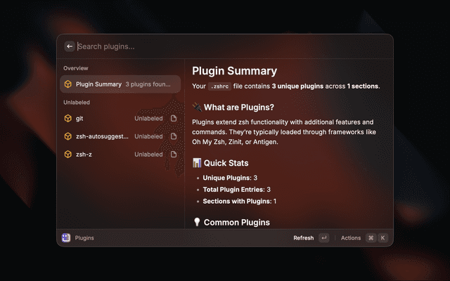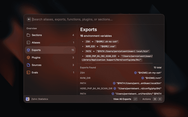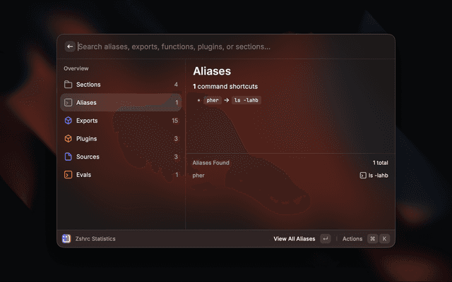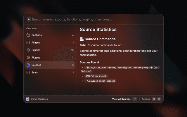 A powerful Raycast extension for managing your ~/.zshrc configuration file. View, organize, and edit your shell aliases, exports, functions, and more with an intuitive interface.