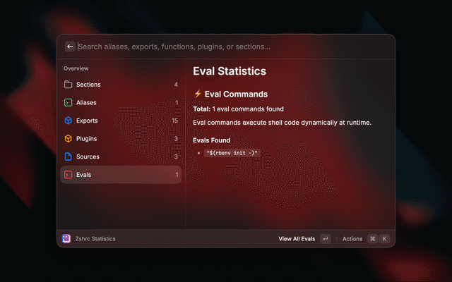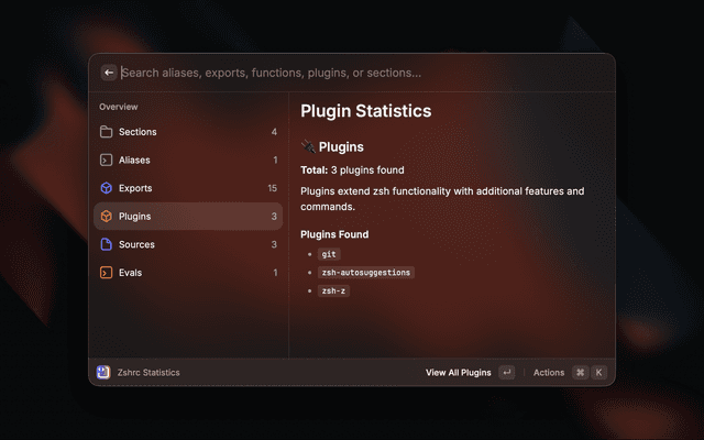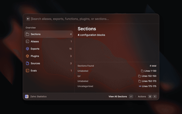 Zshrc StatisticsOverview of your entire zshrc configuration