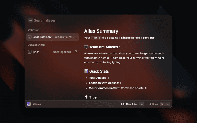 • Search and filter aliases by name, command, or section