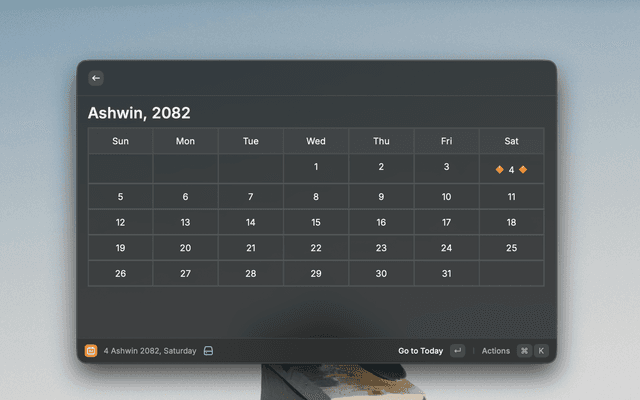 View the Nepali month calendar directly within Raycast. This extension allows you to quickly check dates, navigate through months and years, and view the calendar in either English or Nepali.