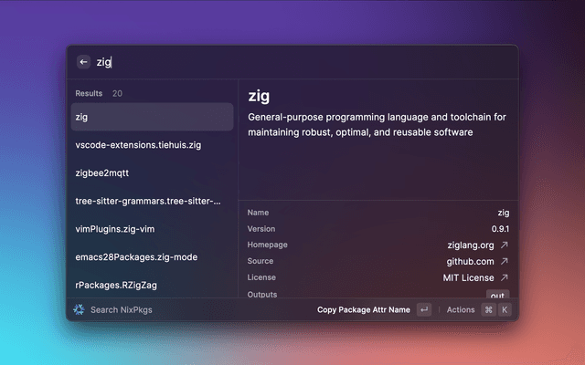 The extension features a branch selector directly in the search interface. Available NixOS branches are validated at runtime to ensure they are currently indexed by search.nixos.org.