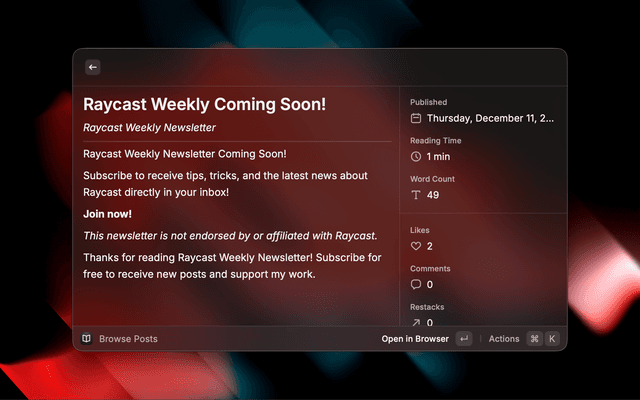 Browse and interact with the Raycast Weekly Newsletter directly from Raycast.
