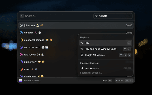 To be able to play a specific sound with a keyboard shortcut, execute the "Add Shortcut" action while focused on a sound in the "Search" command. This will add an Apple Shortcut which contains further instructions (they're few and simple).