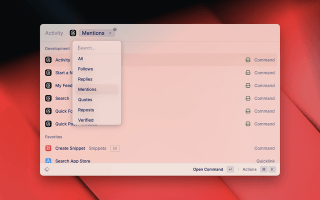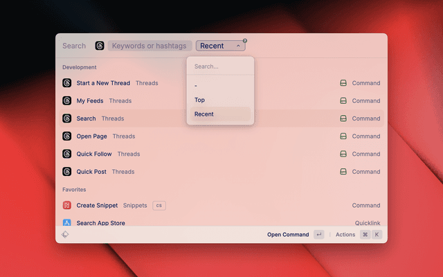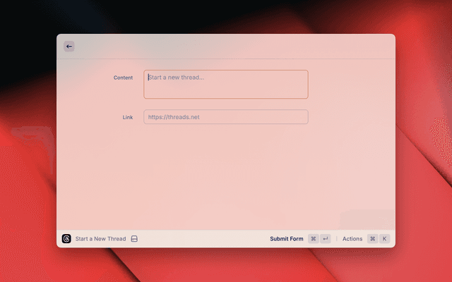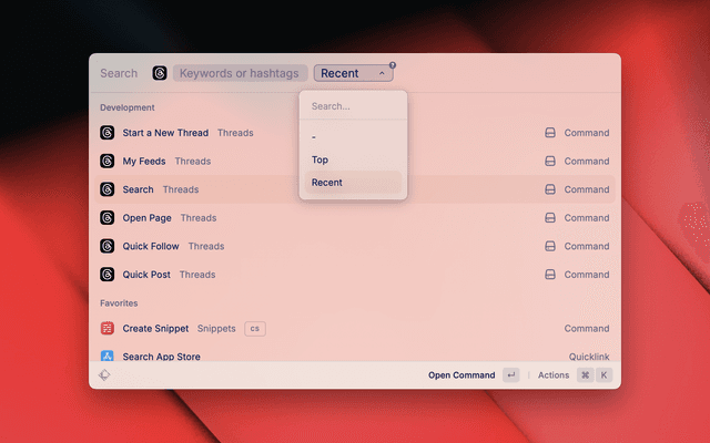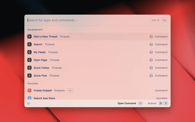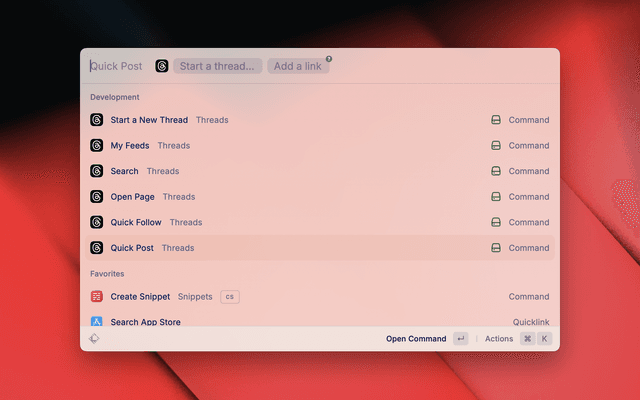 A basic extension for quickly navigating Threads. Post updates, follow users, view profiles, and browse topics directly from Raycast.
