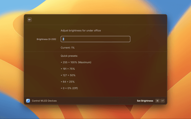 - Brightness Adjustment - Set brightness (0-255) with quick presets (25%, 50%, 75%, 100%)