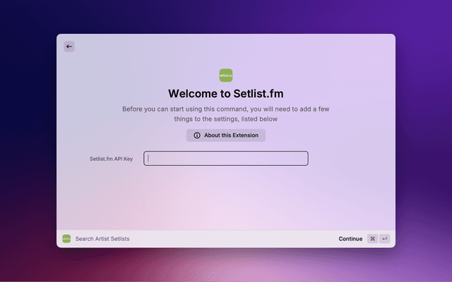 To use this extension you need a setlist.fm account and an API key. You can create your API key here: https://www.setlist.fm/settings/apps