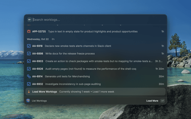 - Open the "List Worklogs" command