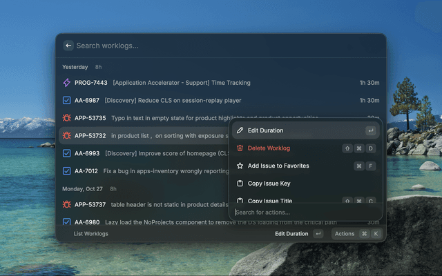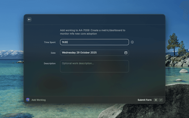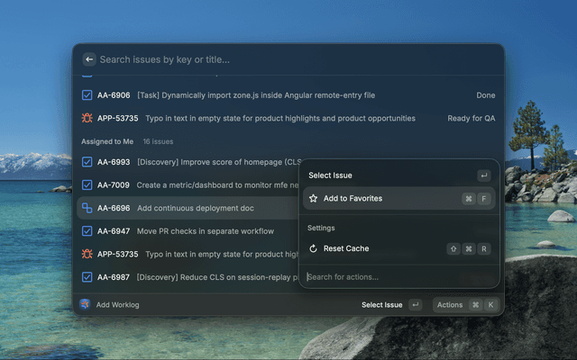 - Add Worklog: Quickly log work hours to any issue with flexible duration formats (1h, 1h30m, 2h)