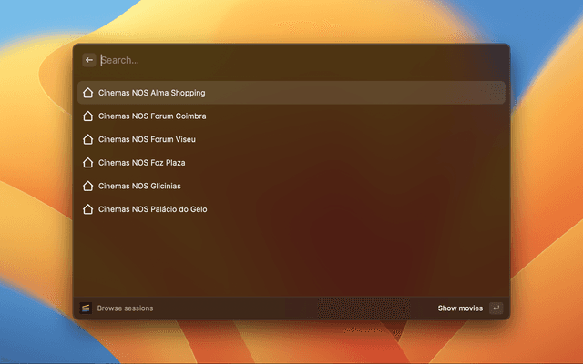Shows all movies and sessions in display by Cinemas NOS.