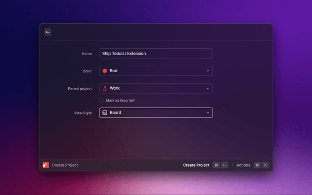 Create ProjectUnfocus Current TaskIn most cases, you can use OAuth to authenticate with Todoist. You'll be prompted to connect your Todoist account when using any of the extension's commands.