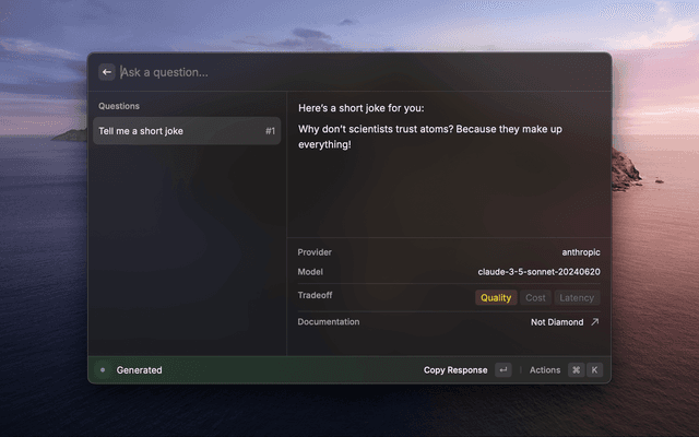 Not Diamond is an AI model router that automatically determines which LLM is best-suited to respond to any query, improving LLM output quality by combining multiple LLMs into a meta-model that learns when to call each LLM. This extension answers always with the best model depending on the prompt.