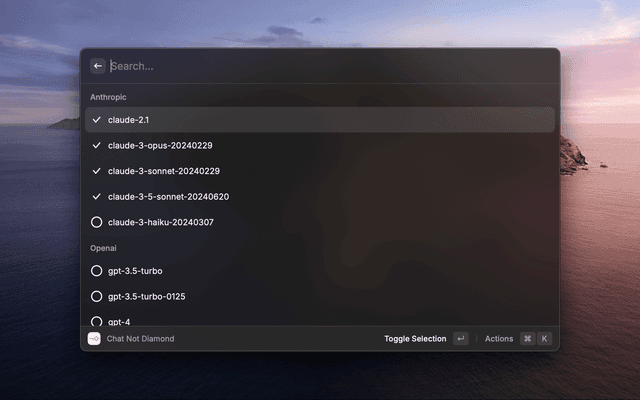 In order to benefit from the best results, make sure to select at least 2 models. All API Keys are optional, but you need to have at least 1 to use Not Diamond Raycast Extension.