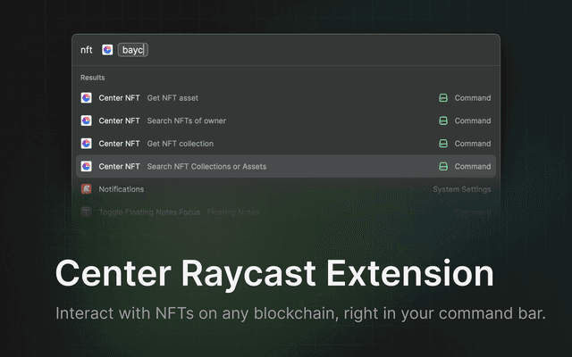 Center Raycast Extension allows you to interact with any NFT collections or assets in any blockchain, right in your command line, powered by Center's NFT API