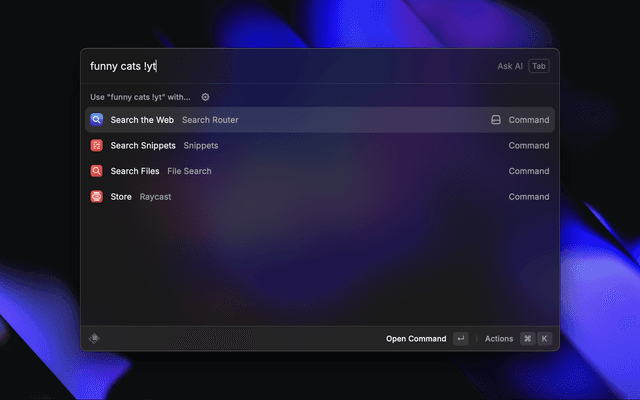 !g cats searches Google for "cats"!w cats searches Wikipedia for "cats"Help me fix my code !t3 uses t3.chat to ask AI to fix your codemarkdown parser @gh searches for "markdown parser" specifically within Github's domain (site:github.com)Pro Tip: β¨ For the best experience, set up Search Router as a Fallback Command in Raycast. This allows you to use bangs directly from the main Raycast search without having to first open the extension!