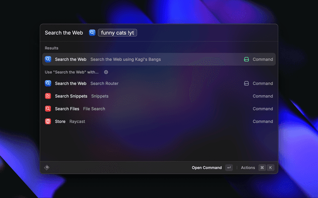 Search Router lets you search specific websites from Raycast using shortcuts by implementing Kagi Search bangs. For example: