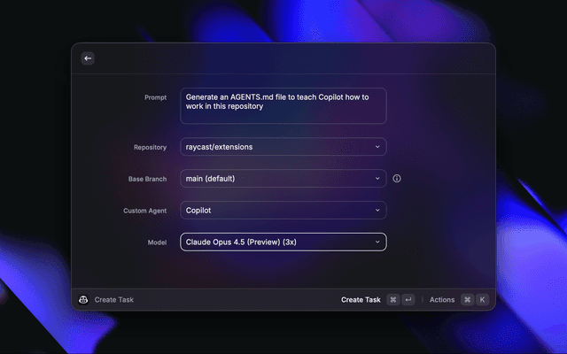 Starting a Copilot coding agent task in Raycast