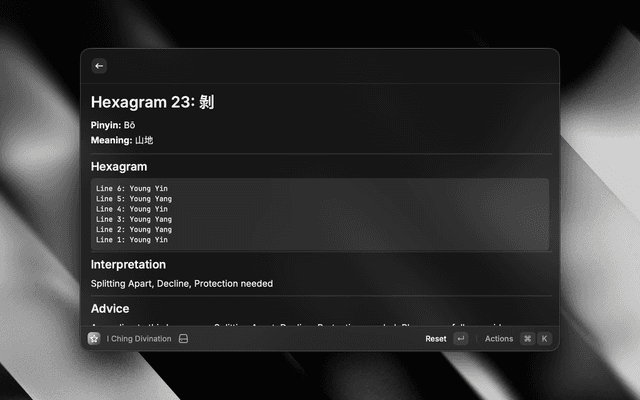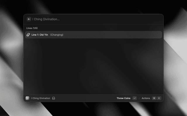 A Raycast extension for performing I Ching divination using the traditional three-coin method. Consult the Book of Changes (易經) for guidance through all 64 hexagrams.