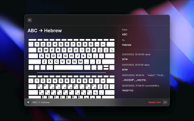 OWL is a powerful Raycast extension that helps you quickly fix mistyped text caused by typing in the wrong keyboard layout. Define your own language-to-language mappings (based on keyboard layouts), and instantly convert any selected text to the correct one using your custom mappings.