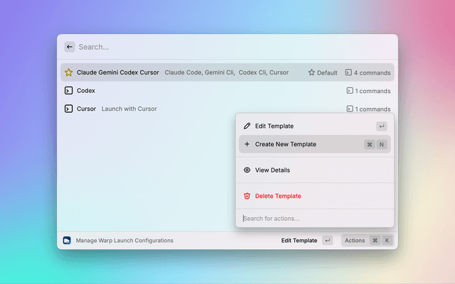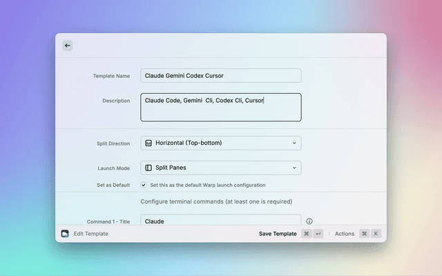 • Creates YAML configuration files in ~/.warp/launch_configurations/