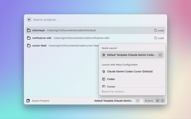 A project launcher for developers. Quickly search projects and launch them with Warp configurations.