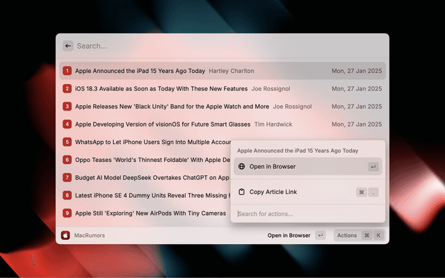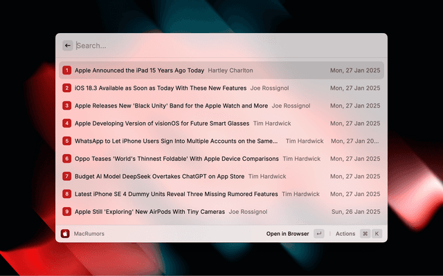 Browse MacRumors headlines from the comfort of Raycast.