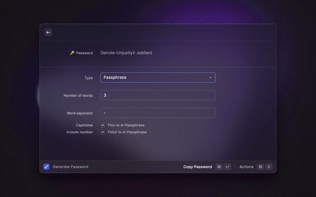 🔎 Search your vault 📋 Copy and paste any field 🔑 Generate passwords and TOTP codes ⭐ Mark items as favorites