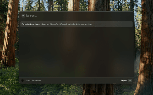 Create Slack TemplateDaily Report){date} - Current date (YYYY-MM-DD){time} - Current time (HH:MM){user} - Your Slack usernameSend Slack Message⌘ + E to edit or ⌃ + X to delete the selected templateExport Templates~/Downloads/slack-templates.jsonImport Templates