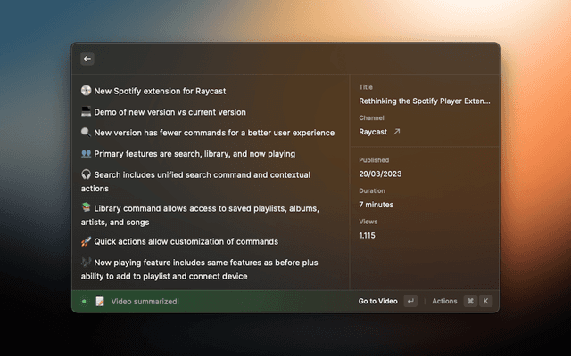 Summarize any YouTube Video with AI and ask follow up questions to get all the details. Choose between Raycast, OpenAI ChatGPT or Anthropic Claude. You have to either be a Raycast Pro Member, have access to an OpenAI API Key or Anthropic API Key to use this extension. Alternatively, you can use the extension with Ollama to summarize YouTube videos using a local LLM.