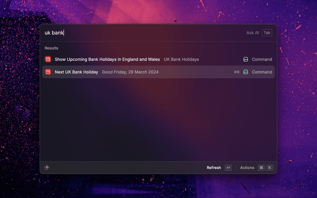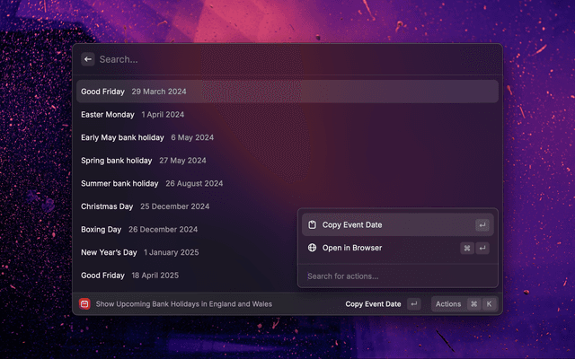 This Raycast extension provides upcoming bank holiday information for England and Wales.