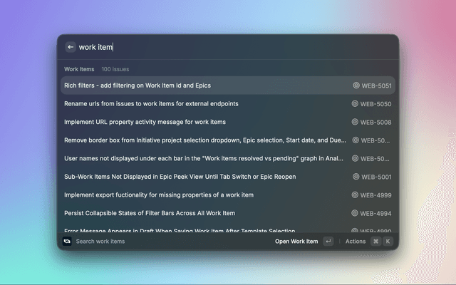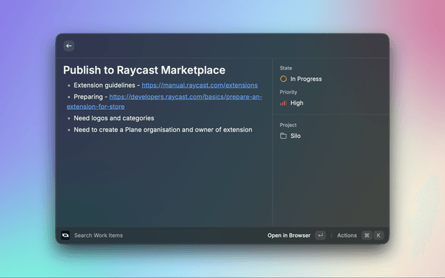 A powerful Raycast extension for managing work items in Plane, the open-source project management tool. This extension allows you to create, search, view, and manage work items directly from your macOS command palette.