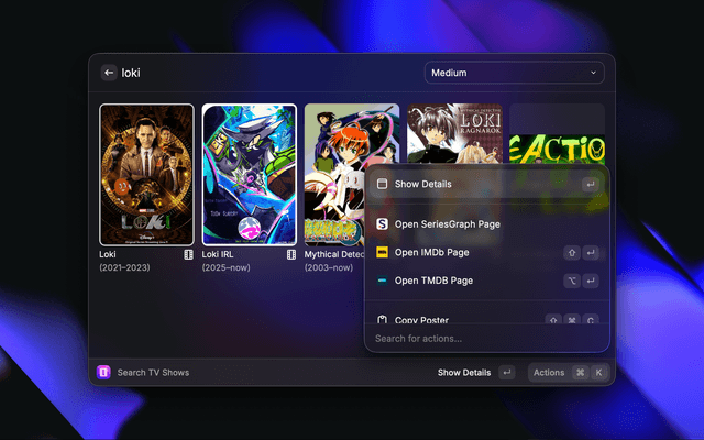 A Raycast extension to search TV shows and visualize episode ratings with graphs.