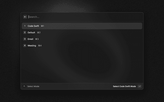 Change modes, start and stop recordings, search history, copy or paste the most recent transcript, and open settings. Choose AI Processed or Unprocessed transcript variants in command settings for history copy/paste commands. Set a custom recording directory for Search History via command preferences.