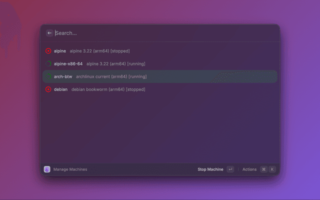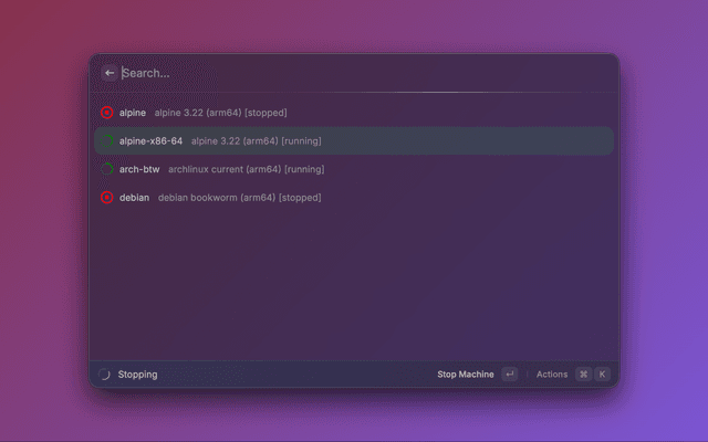 • Machine Management - Start, stop, and monitor OrbStack Linux machines instantly