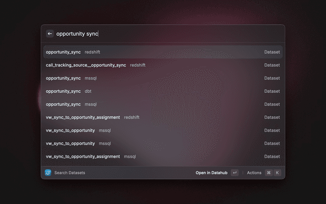Search and explore datasets in your DataHub data catalog directly from Raycast.