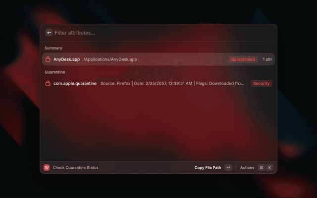 Opens a file picker (or uses your current Finder selection), then shows a full breakdown of the file's quarantine status and extended attributes. From there you can remove the quarantine flag in one action.