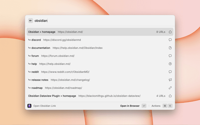 • Powerful Search: Leverage Obsidian's existing organization with Raycast's quick access