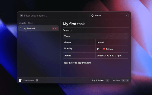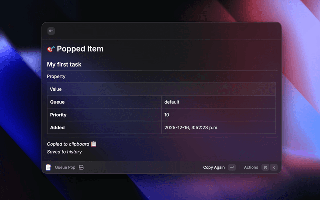 • Queue Pop: Pop the highest priority item (copies to clipboard automatically)