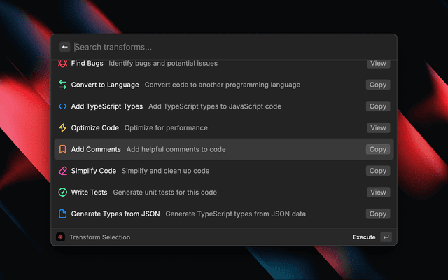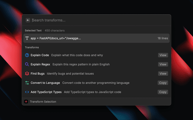 One-keystroke code transformations from any app.