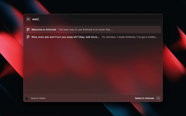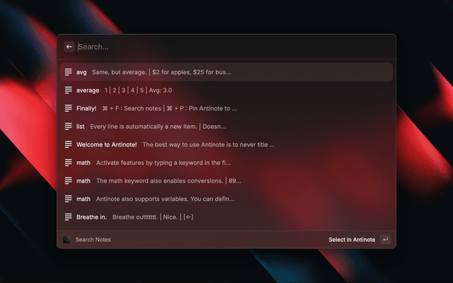 Extension to control Antinote app. Create new notes, search notes and pin/unpin Antinote with Raycast.