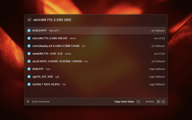 Convert colors between formats with wide gamut support.