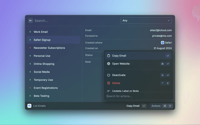 Quick and easy way to view and manage your Hide My Email addresses.
