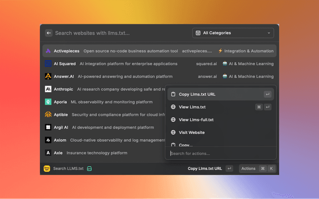 • ๐Ÿ” Smart Search: Quickly find websites that implement llms.txt and llms-full.txt proposed standards