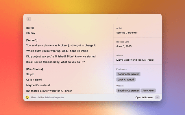 Search by song title to instantly view lyrics, or enter remembered lyrics to quickly find the song's title, utilizing the Genius Lyrics API.