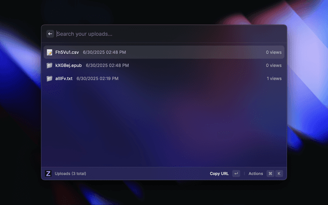 Manage your self-hosted Zipline uploads directly from Raycast. Browse, upload, and share files and text from your clipboard.