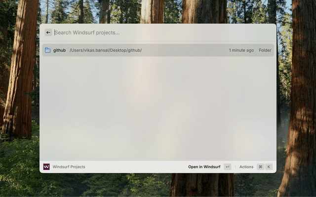 1. In the "Windsurf Projects" command, press Cmd+N or use the action panel
