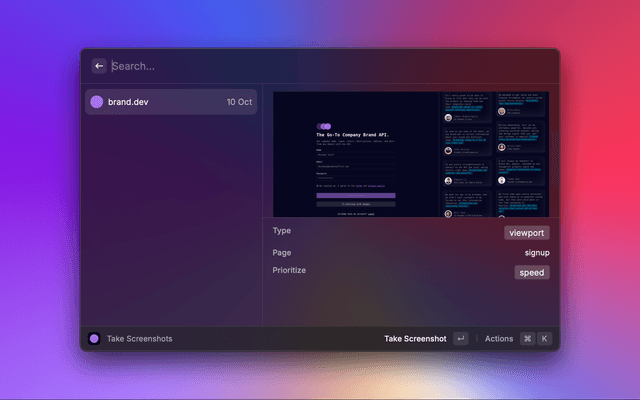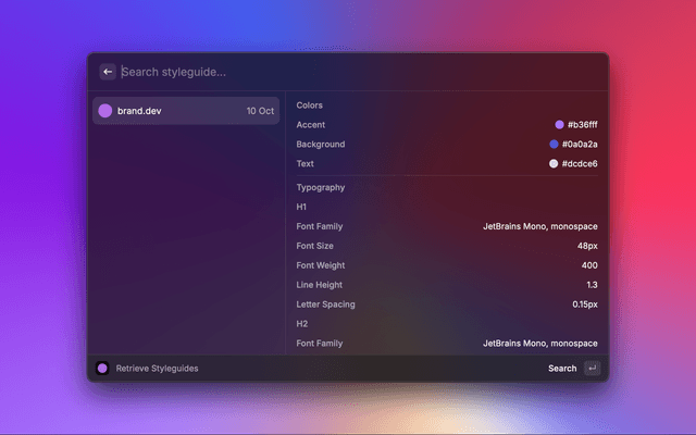This is a Raycast extension to get a company's brand logos, colors, slogan, socials, and more via the Brand.dev API.